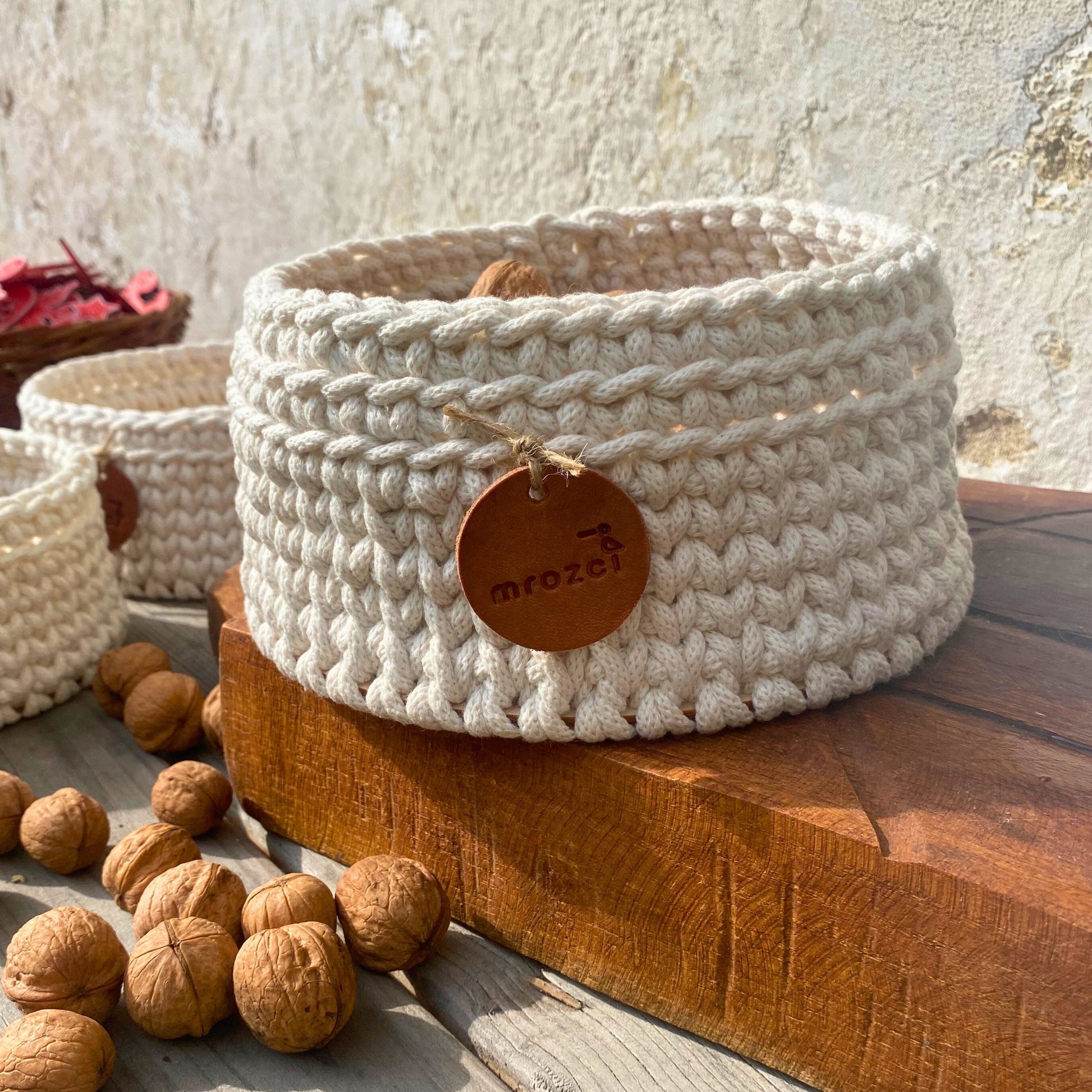 The basket is crocheted from recycled cotton cords. The bottom is solid wood (plywood). A leather tag with my logo is attached to the basket.