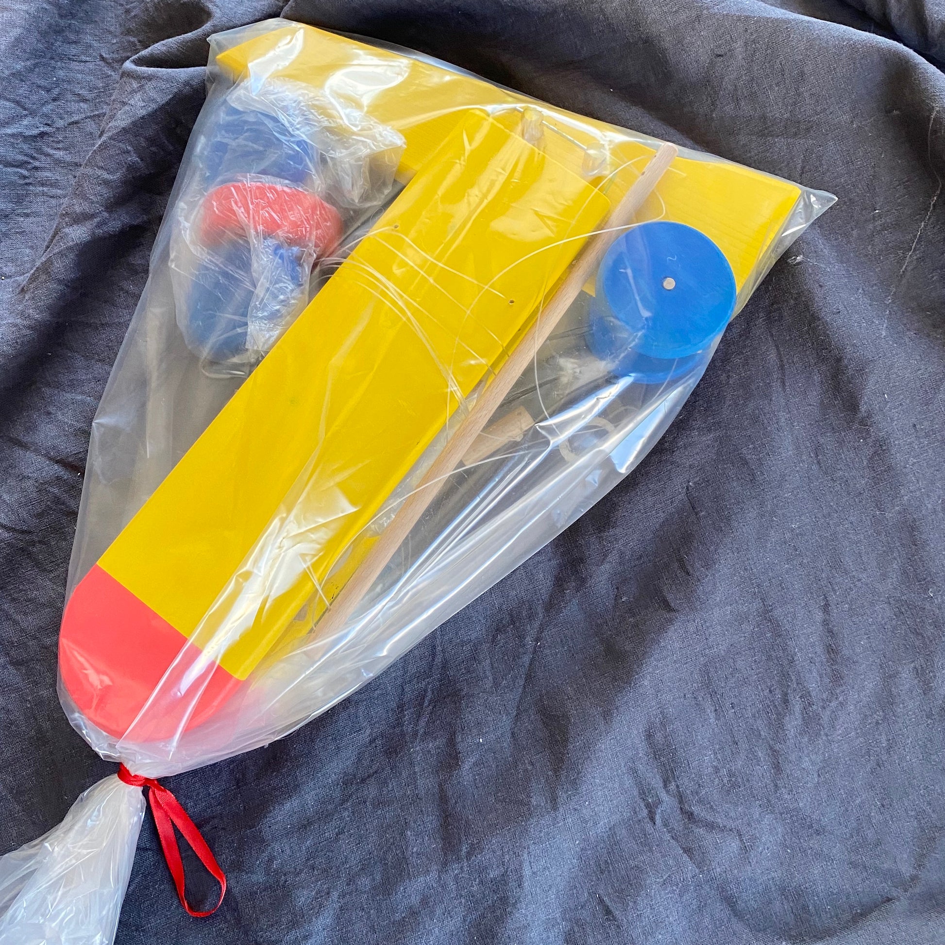 The airplane is handmade out of spruce wood. Weighed out by hand colored by hand. Colors are non-toxic and completely safe for kids.