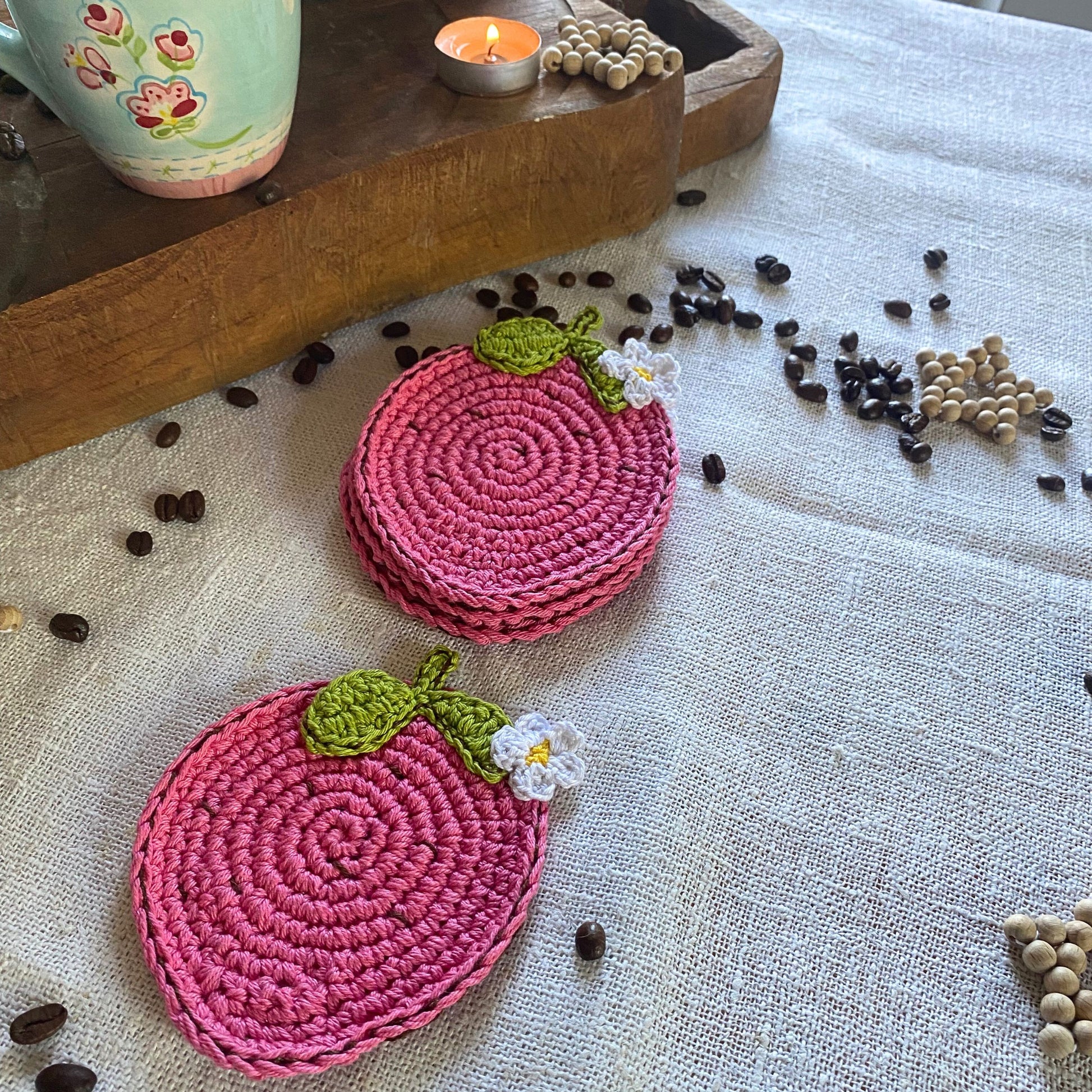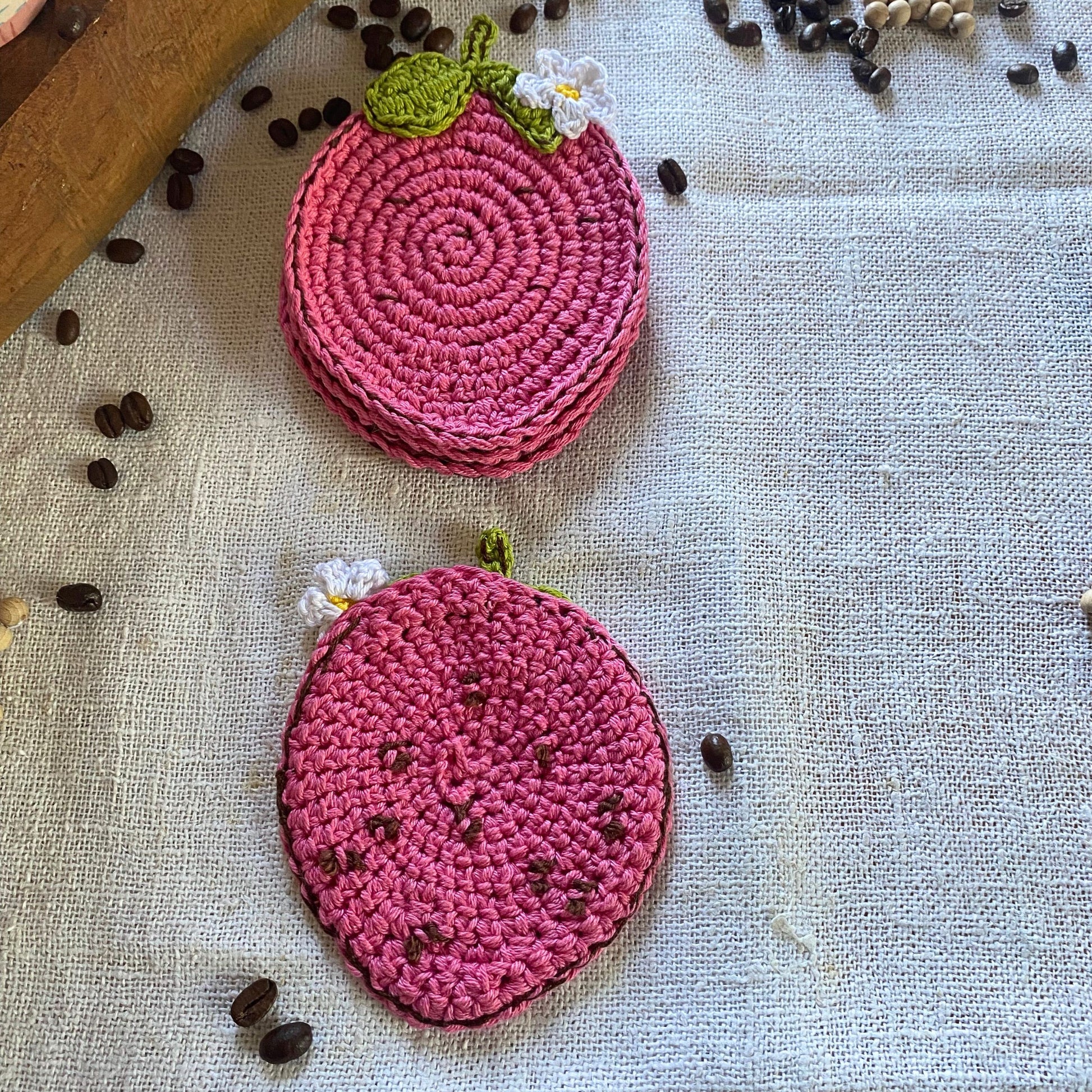 The pink strawberry coasters are crocheted from 100% cotton yarn.